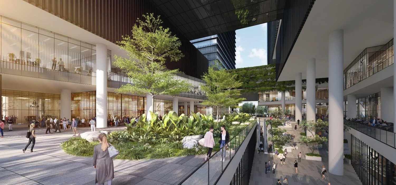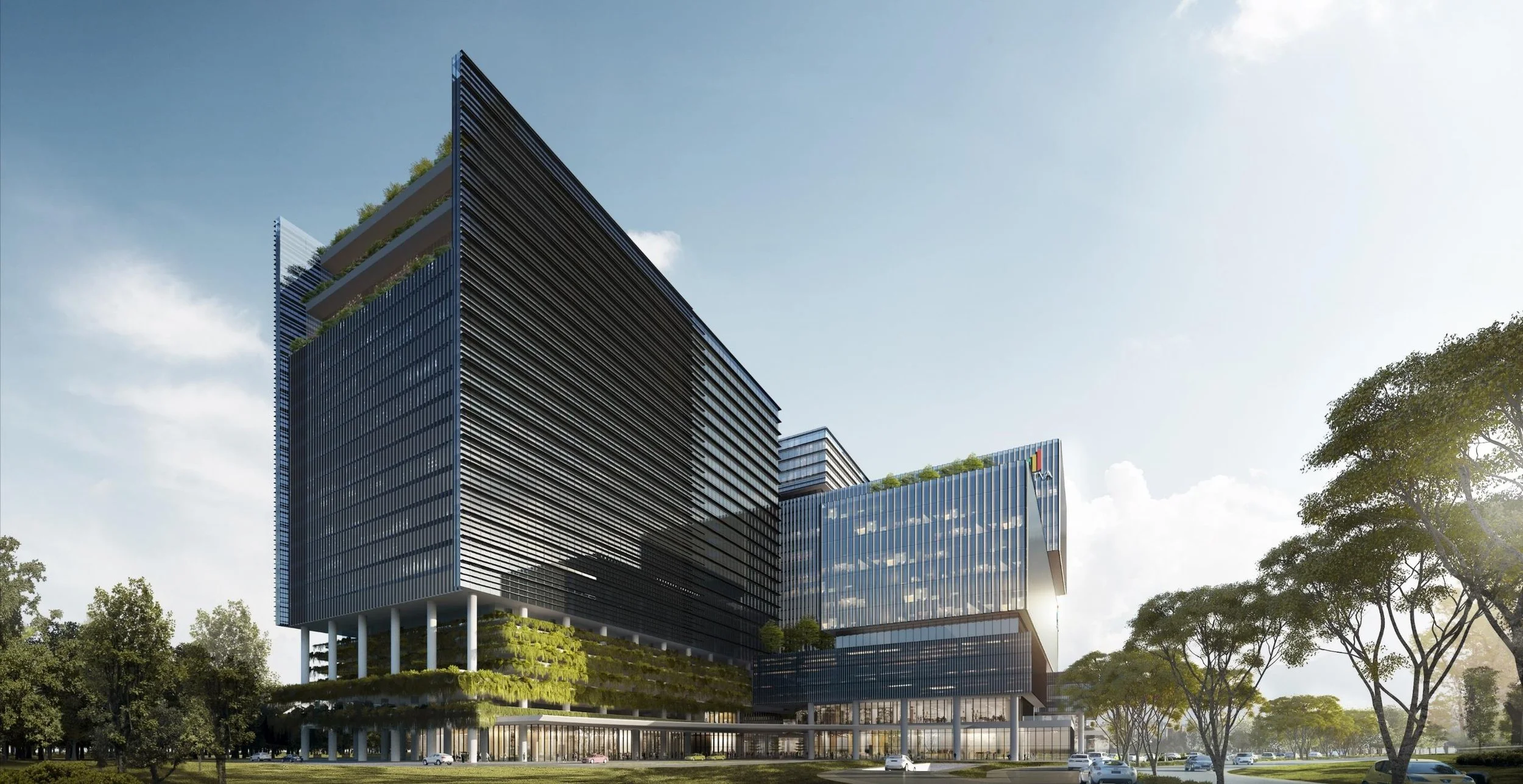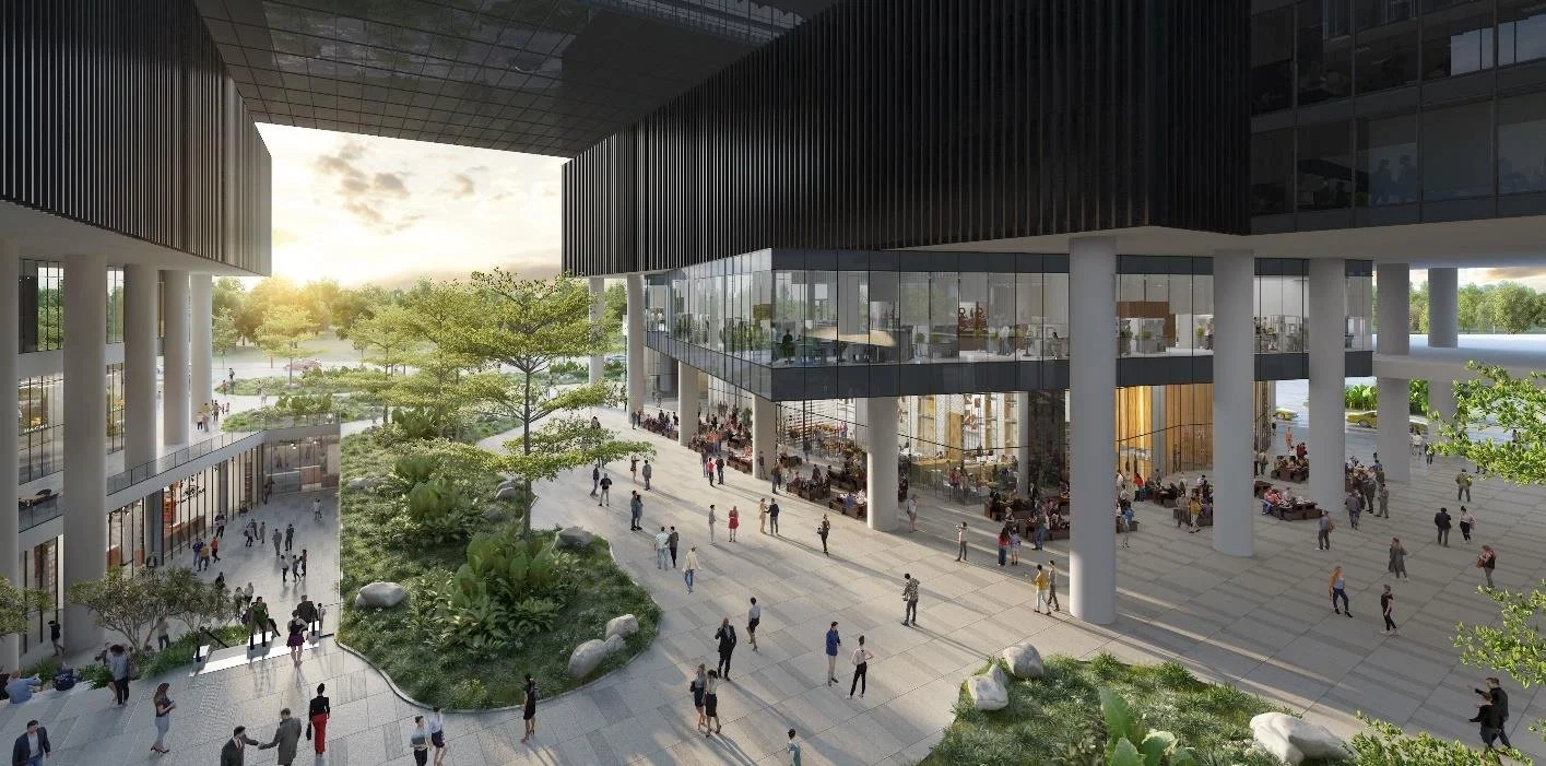 To optimize site usage, the two towers were strategically merged, enabling efficient phasing while freeing up the ground level to create a vibrant central plaza—a communal space where tenants can gather, relax, and connect. This open plaza is seamlessly integrated with a basement-level bus station that links the building to the wider campus, promoting ease of movement and public transit access. Throughout, the design embraces sustainability through integrated parks and landscape strategies that elevate the workplace experience and reinforce a commitment to environmental well-being.