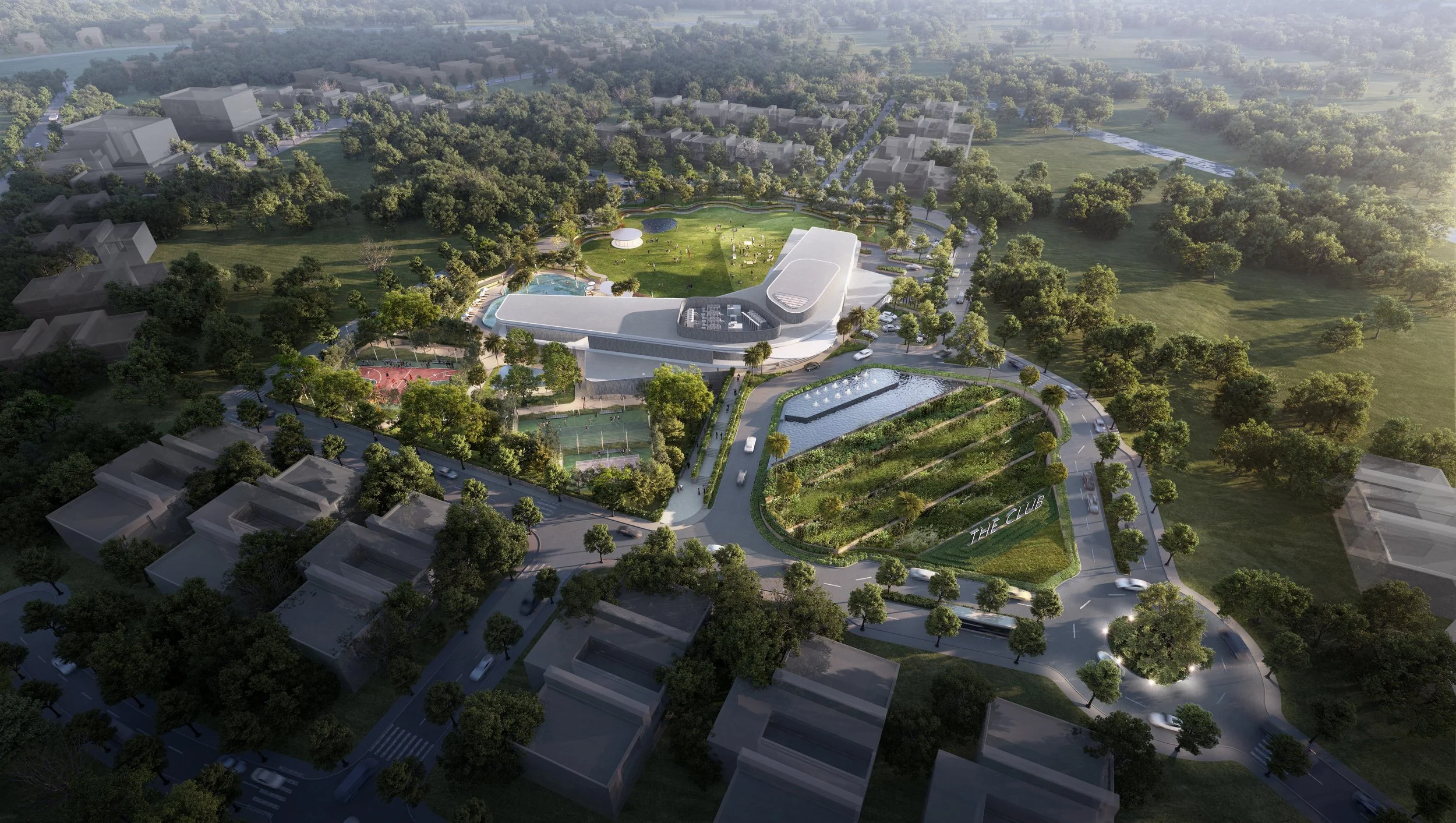 The form is shaped to balance visibility and lightness — appearing almost floating within the landscape — while organising clear drop-off, circulation, and functional zones around it. This clarity of form and movement establishes the clubhouse as the natural centre of orientation, gathering, and activity within the development.